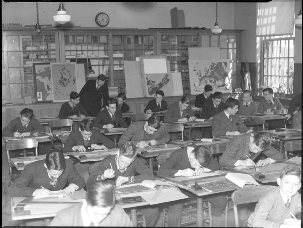 Nous voyons l'intérieur de l'atelier d'art du «West Hill High School», situé au 4400 de l'avenue West Hill dans l'ouest de Montréal. Nous apercevons les étudiants assis à des pupitres reproduisant des figures géométriques à l'aide d'instruments de dessin (compas, règle, rapporteur d'angles, etc.)