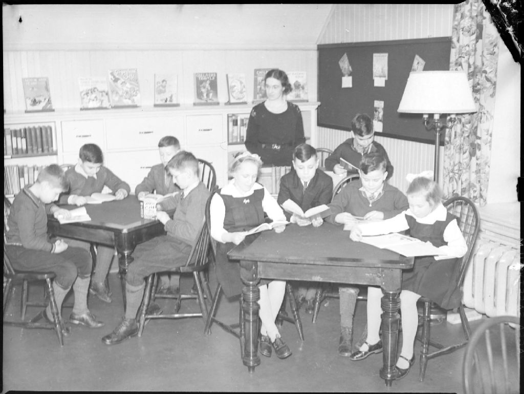 Nous voyons un groupe d'enfants de l'Institut Mackay pour sourds et muets, assis à des pupitres et feuilletant des livres dans une salle de lecture. Cette maison d'enseignement se trouvait située au 1411 rue Crescent dans l'ouest de Montréal. Nous apercevons une éducatrice debout devant des présentoirs avec des revues et des livres