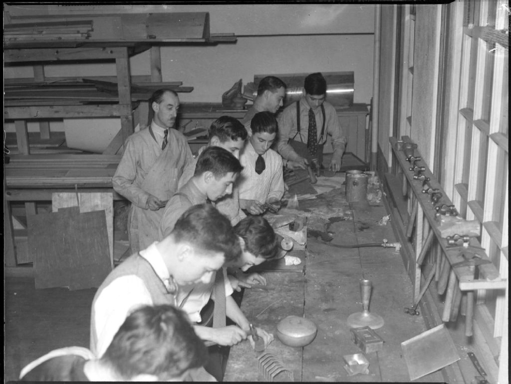 Nous voyons des élèves du «Argyle School», situé au 41 du chemin Côte-Saint-Antoine à Westmount, dans l'atelier de métal, utilisant divers outils pour travailler le métal : chalumeau soudeur, briquet, marteau, limes et autres