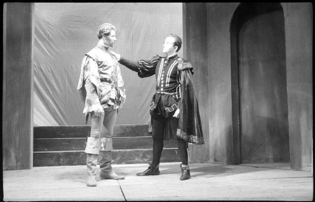 Nous voyons deux étudiants costumés donnant en représentation la pièce «Othello» de Shakespeare sur la scène du «Sir George-William College», 1441 rue Drummond dans l'ouest de Montréal. Nous apercevons un décor de salle de château avec des voûtes en arcade