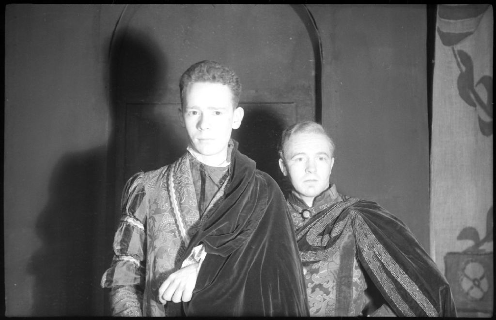 Nous voyons deux étudiants costumés de pourpoints, jouant la pièce «Othello» de Shakespeare sur la scène du «Sir George-William College», 1441 rue Drummond dans l'ouest de Montréal. Nous remarquons que l'un des acteurs est de race noire