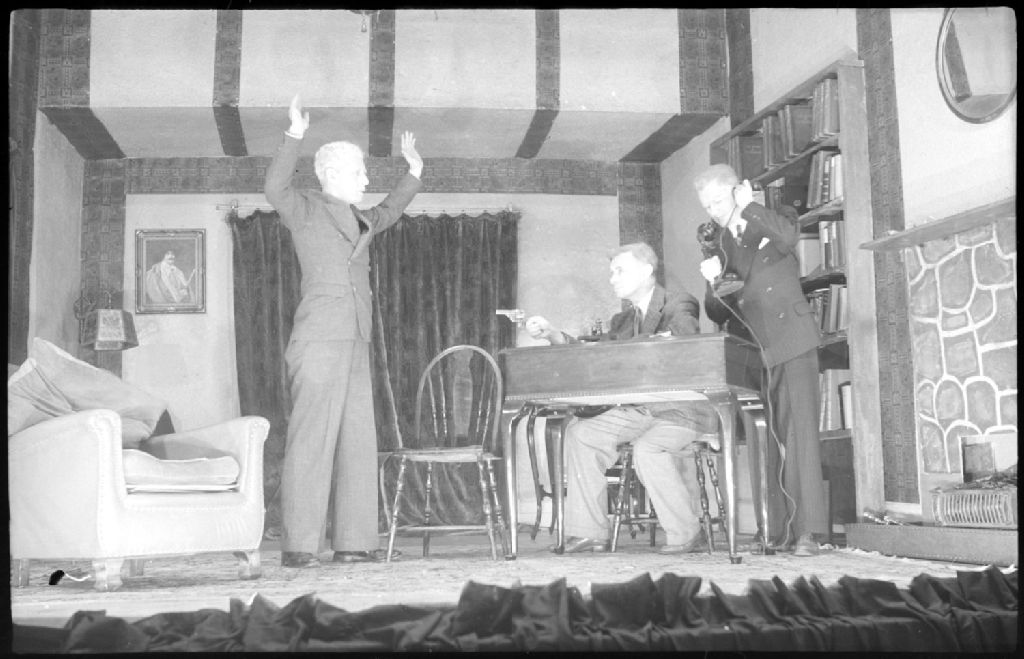 Nous voyons trois comédiens du «Mount Royal Dramatic Club» sur une scène lors de la représentation de la pièce «The Perfect Alibi». Nous apercevons l'un des comédiens assis à une table pointant un revolver sur un autre les bras en l'air. L'action se passe à l'intérieur du décor reconstitué d'un salon avec des fauteuils, un bureau et des bibliothèques. Un troisième acteur tient un téléphone dans ses mains