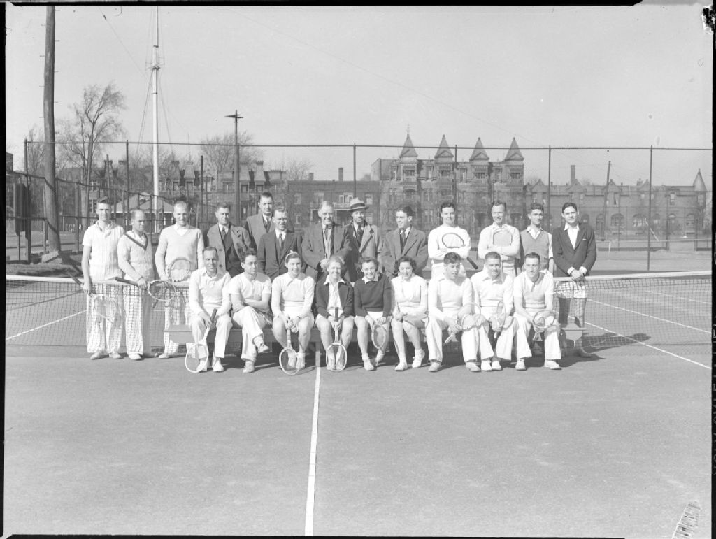 Nous apercevons les membres, femmes et hommes, du «Westmount Athletic Grounds» posant, les uns en costume de sport, les autres en tenue de ville, sur un court de tennis près d'un filet. Certains tiennent leur raquette de tennis. Nous apercevons, derrière les toits, des maisons en rangée