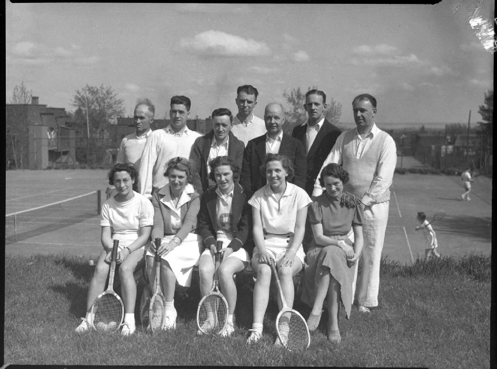 Nous apercevons un groupe de jeunes joueurs de tennis du «N.D.G. Tennis Club», femmes et hommes, posant en tenue sport et avec leurs raquettes. Ils sont postés à l'extrémité d'un court de tennis situé dans Notre-Dame-de-Grâce à Montréal, sur lequel nous voyons des joueurs en action