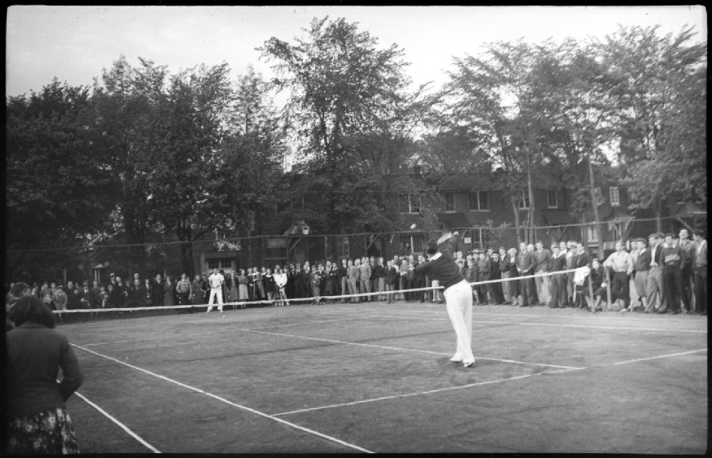 Nous voyons un joueur du nom de Bob Murray lors d'une partie de tennis sur un court de tennis de Montréal-Ouest. Nous apercevons une foule de spectateurs observant la joute