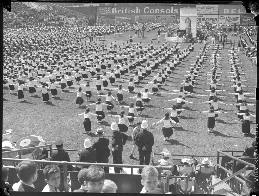 - Lors du festival sportif des écoles catholiques de l'Île de Montréal, nous voyons, exécutant des figures de gymnastique dans le stade Delorimier à Montréal, des groupes de jeunes filles pour la plupart, en robes à col marin. Nous apercevons de nombreuses réclames publicitaires en arrière-plan de marques de commerce connues, telles British Consol, Dow, DeKuyper, Seagram, de même qu'une estrade avec des instruments de musique. Nous remarquons des policiers en uniforme avec des casques de type bombe à l'avant-plan