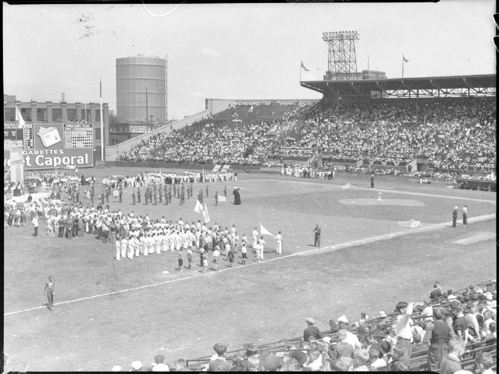 Lors du festival sportif des écoles catholiques de l'Île de Montréal, nous voyons, dans le stade Delorimier à Montréal, des groupes de jeunes gens dont certains avec des instruments de musique. Nous apercevons un tableau d'affichage des scores avec une réclame publicitaire pour les cigarettes Sweet Caporal, de même qu'une estrade avec des haut-parleurs. Nous remarquons des spectateurs remplissant les gradins