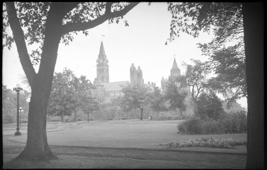 Nous voyons la colline parlementaire à Ottawa, avec des arbres, des lampadaires, des plates-bandes et, en arrière-plan, l'édifice du parlement avec ses tourelles