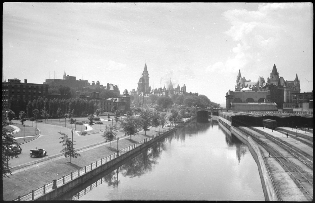 Nous voyons le canal Rideau avec, à l'arrière-plan, les édifices de la colline parlementaire à Ottawa, de même que les berges du canal et des rails de chemin de fer d'un côté