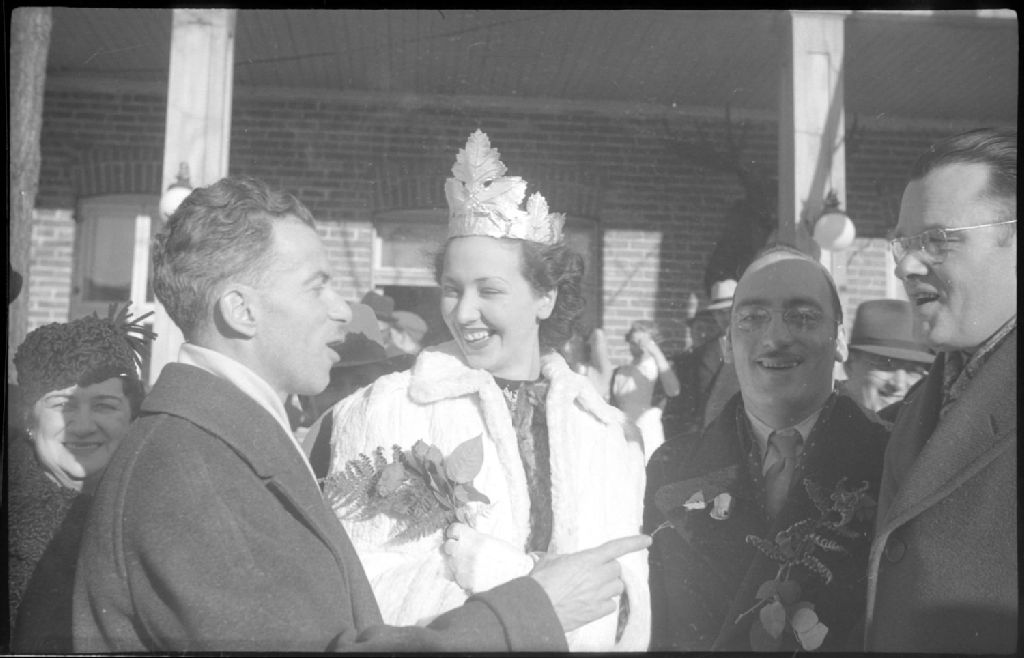 Nous voyons une femme du nom de Diana Cook, la reine du sport, coiffée d'une couronne de feuilles d'érable, vêtue d'un manteau de fourrure et tenant une gerbe de roses, en compagnie de monsieur Damien Paris, à sa gauche, et du docteur Jacques Cartier, à sa droite