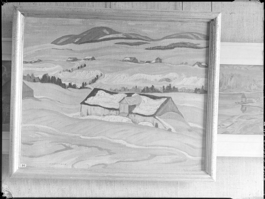 Nous voyons, exposée dans une galerie d'art à Montréal, une oeuvre peinte portant le numéro 26 et représentant une maison engloutie sous la neige au milieu d'un champ et signée A. W. Jackson