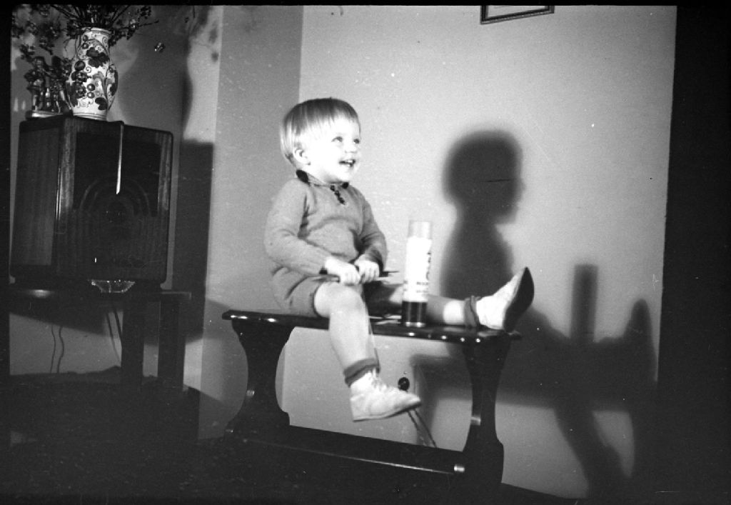 Nous voyons un bambin du nom de Fred Luck vêtu d'une veste de laine ainsi que d'un pantalon court et tenant un jeu de baguettes «Pick Up Sticks» dans les mains