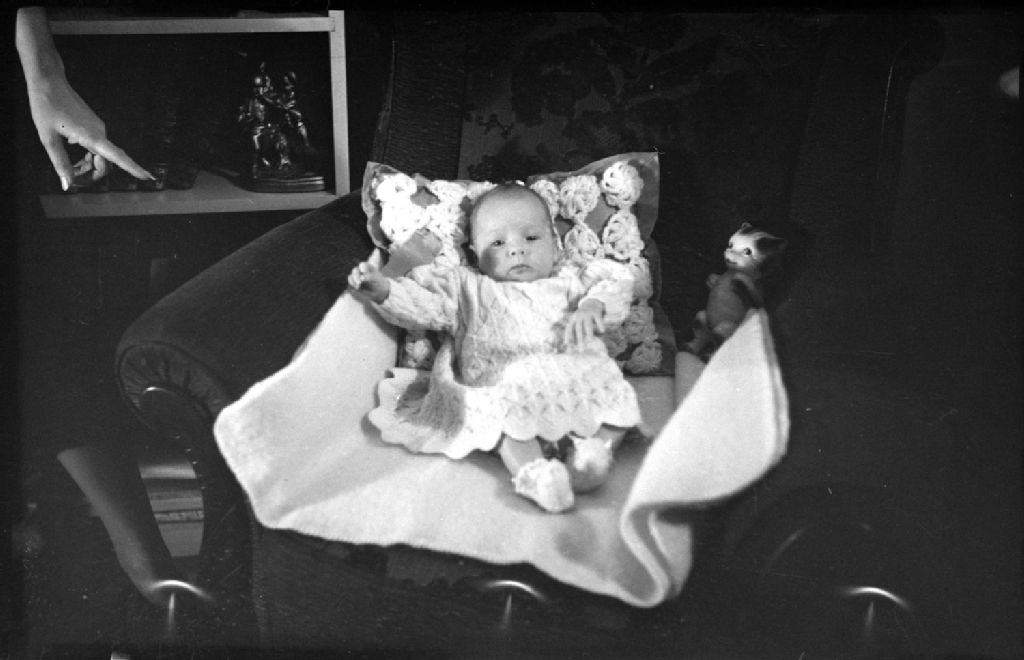 Nous voyons une fillette du nom de Deanna Luck vêtue d'une robe de laine tricotée et de pantoufles, posant appuyée contre un coussin au creux d'un fauteuil