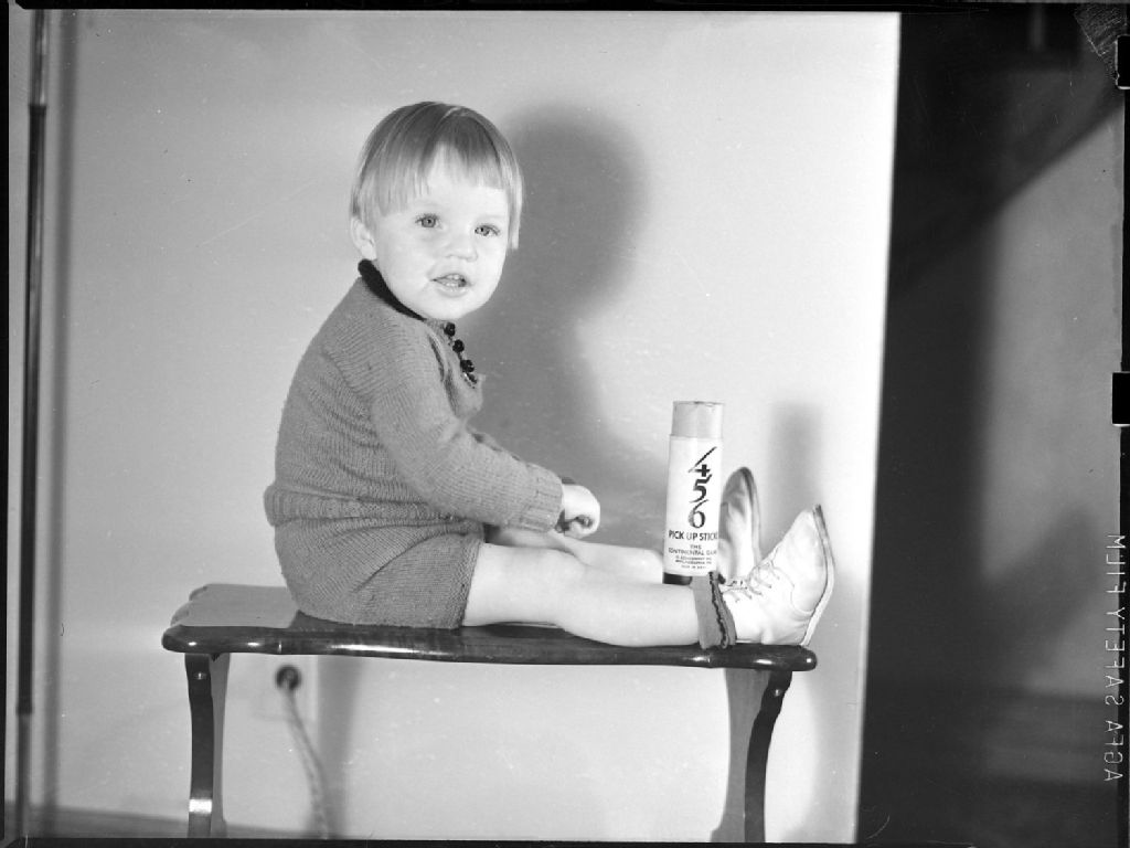 Nous voyons un bambin du nom de Fred Luck vêtu d'un ensemble de laine et assis sur une banquette avec une boîte de jeu de baguette «Pick Up Sticks»