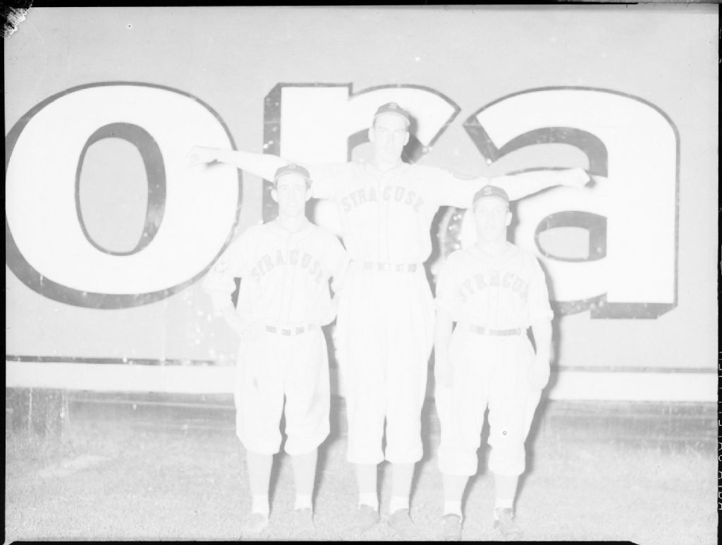 Nous voyons trois joueurs de baseball de l'équipe de Syracuse posant en uniforme