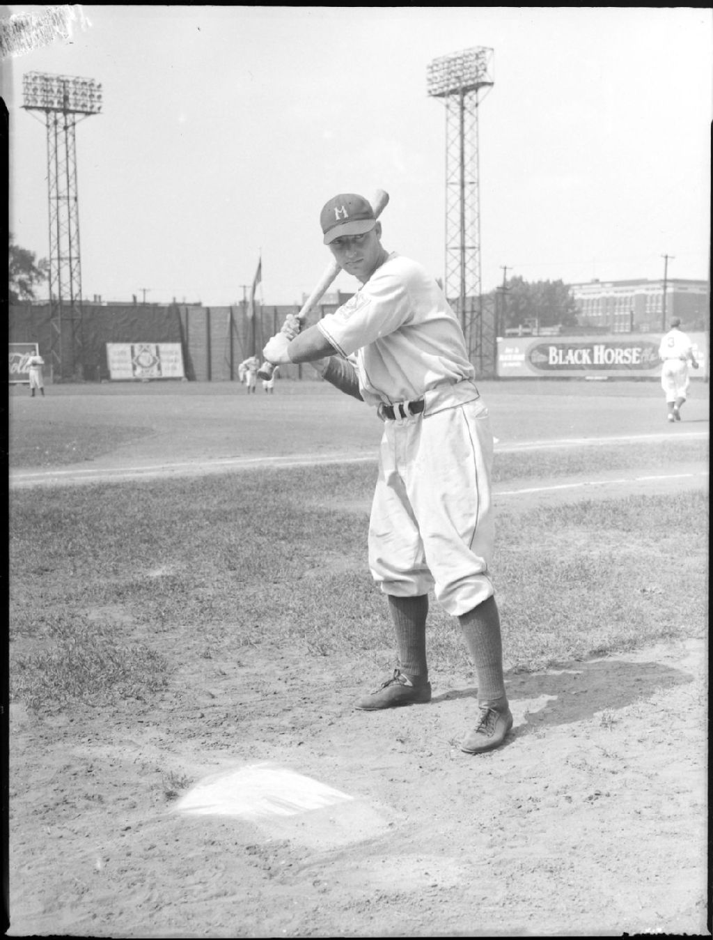 Nous voyons le joueur de baseball Maurice Van Robays de l'équipe des «Royals» de Montréal posant au bâton dans le stade Delorimier à Montréal. Nous apercevons à l'arrière-plan une réclame pour la marque de bière Black Horse, ainsi que deux pylônes