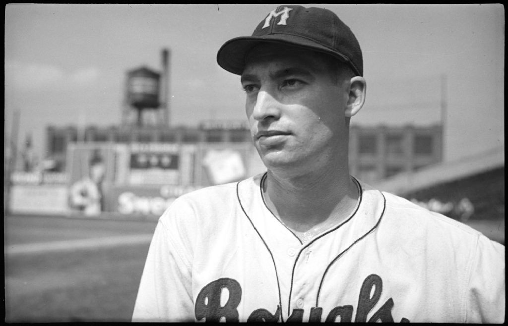 Nous voyons le joueur de baseball Maurice Van Robays de l'équipe des «Royals» dans le stade Delorimier à Montréal