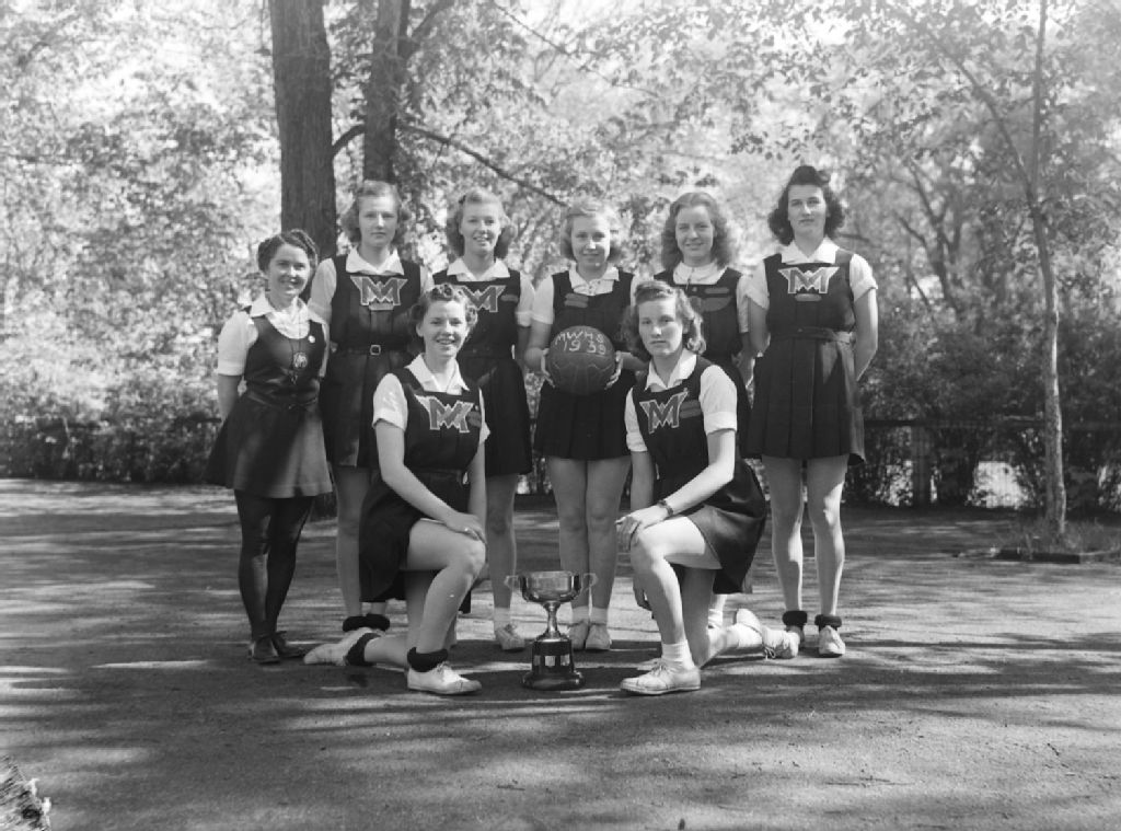 Nous voyons des jeunes filles en tenue sportive, membres de l'équipe de basketball du «Montreal West High School» de Montréal-Ouest posant devant un trophée sur un terrain de jeu. Nous apercevons, entre autres, Shirley Mackeen