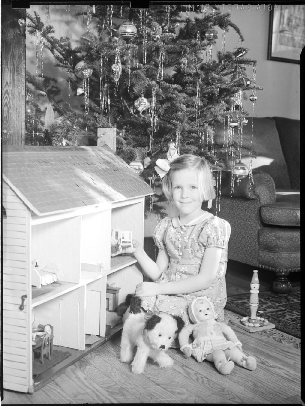 Nous voyons une fillette du nom de Beverley Smith posant assise à côté d'une maison de poupée et tenant une chaise miniature. Nous apercevons un ours en peluche et une poupée de chiffon et à l'arrière-plan un sapin de Noël décoré