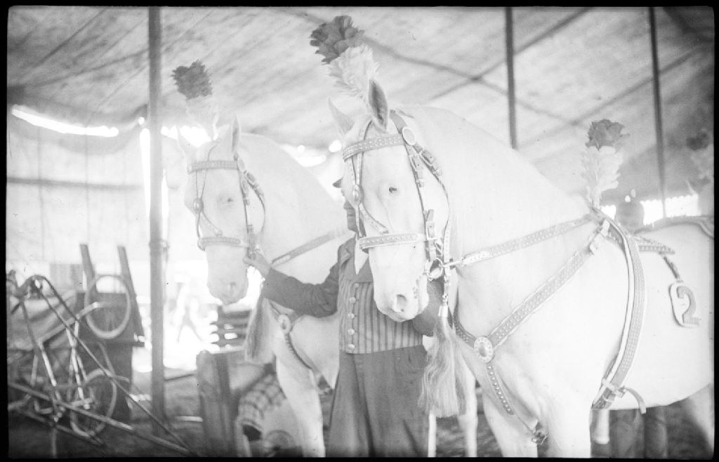 Nous voyons un écuyer en costume et casquette, tenant par les brides deux chevaux décorés de harnais d'apparat, à côté du chapiteau du cirque «Barnum and Bailey»