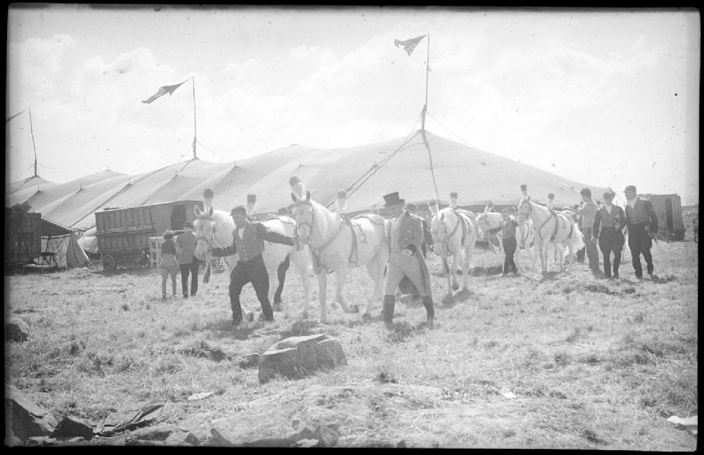 Nous voyons plusieurs écuyers en costume et casquette, tenant par les brides des chevaux décorés de harnais d'apparat, à côté du grand chapiteau du cirque «Barnum and Bailey»