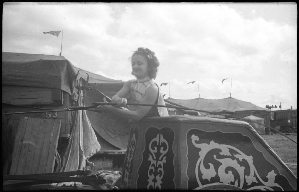 Nous voyons une jeune femme en costume de scène debout dans un chariot décoré de motifs ornementaux, sur le site des installations foraines du cirque américain «Barnum and Bailey» en représentation à Montréal. Nous apercevons des chapiteaux derrière