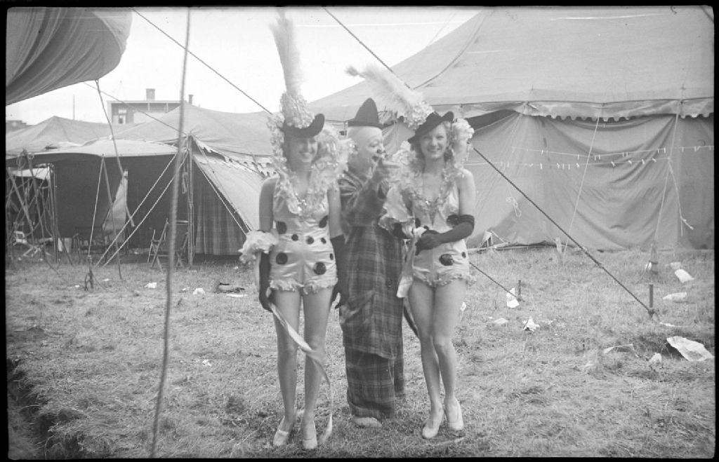 Nous voyons deux jeunes filles en maillots de satin et coiffées de chapeaux posant en compagnie d'un clown sur le site des installations foraines du cirque américain «Barnum and Bailey» en représentation à Montréal. Nous apercevons derrière quelques tentes dressées sur le site