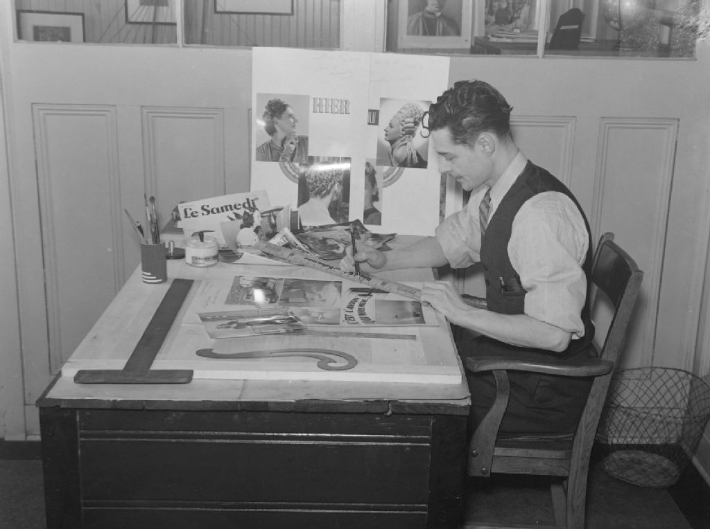 Nous voyons un homme travaillant à une table sur laquelle nous pouvons identifier des documents et photographies au cours de l'opération de mise en page du journal Le Samedi. Nous remarquons divers outils de travail, dont des règles, un pot de colle, des crayons et des plumes. Les locaux du journal La Samedi se trouvaient situés au 975, rue de Bullion à Montréal