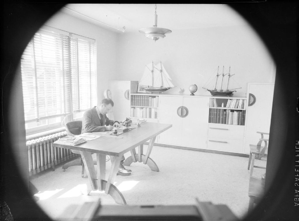 Nous voyons l'intérieur du bureau de Monsieur Chauvin dans l'édifice du journal Le Samedi, situé au 975, de Bullion, à Montréal. Nous l'apercevons travaillant et remarquons un téléphone et un encrier sur sa table ainsi que deux modèles miniatures de voiliers sur une bibliothèque