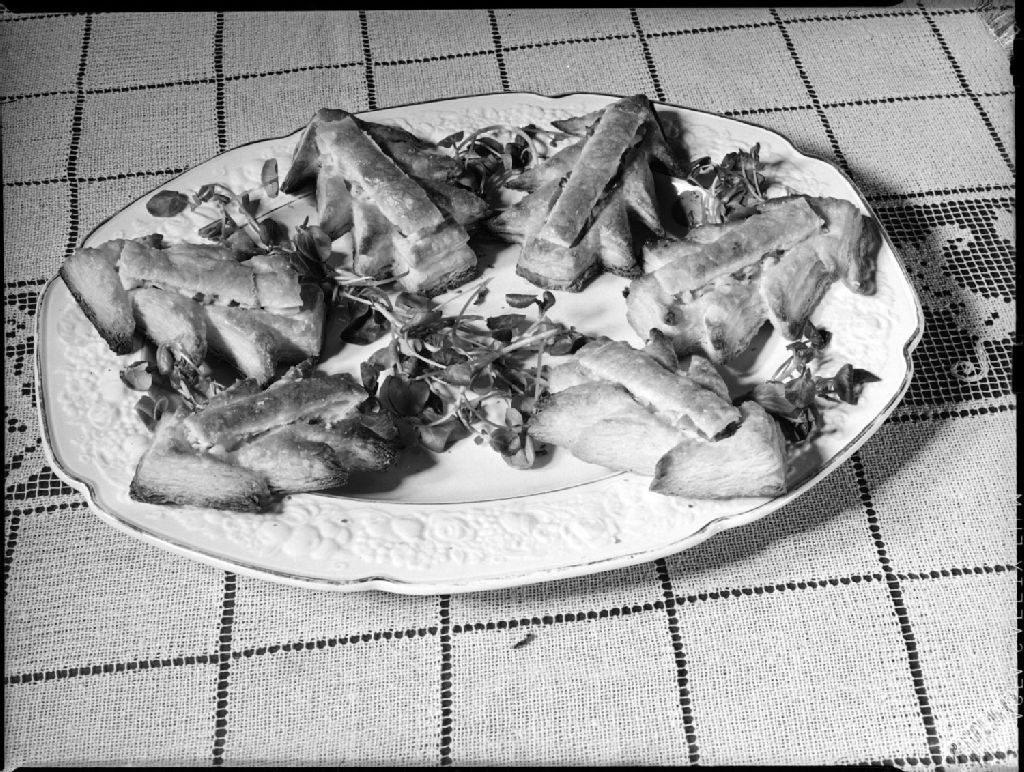 Nous voyons sur une assiette de service ovale des pâtisseries décorées, réalisées à l'École ménagère provinciale, située au 461, rue Sherbrooke est à Montréal