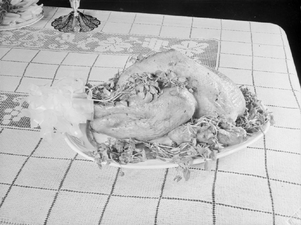 Nous voyons sur une assiette de service une dinde de Noël décorée avec des herbes aromatiques fraîches, réalisée à l'École ménagère provinciale, située au 461, rue Sherbrooke Est à Montréal
