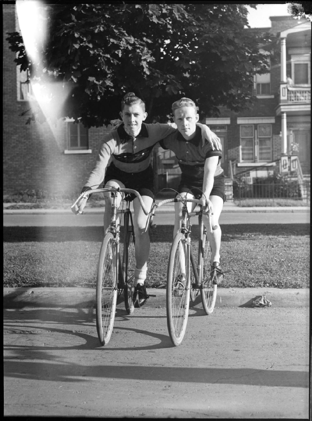 Nous voyons à gauche le cycliste Gunner Erickson, gagnant de l'épreuve de course cycliste Longueuil - Waterloo couvrant une distance de 58 milles, posant en compagnie de Bob Taylor qui se classa en deuxième place. Nous les apercevons sur leurs vélos posant en maillot de course et se tenant par l'épaule. Ils étaient membres du «Wolfe Cycle Club» de Verdun