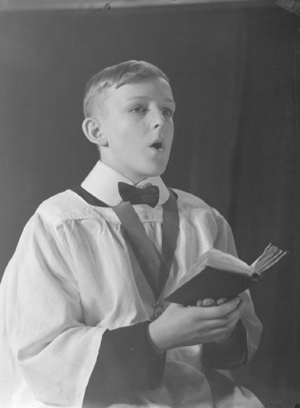 Nous voyons un homme vêtu d'une toge et d'un noeud papillon tenant en main un recueil et chantant
