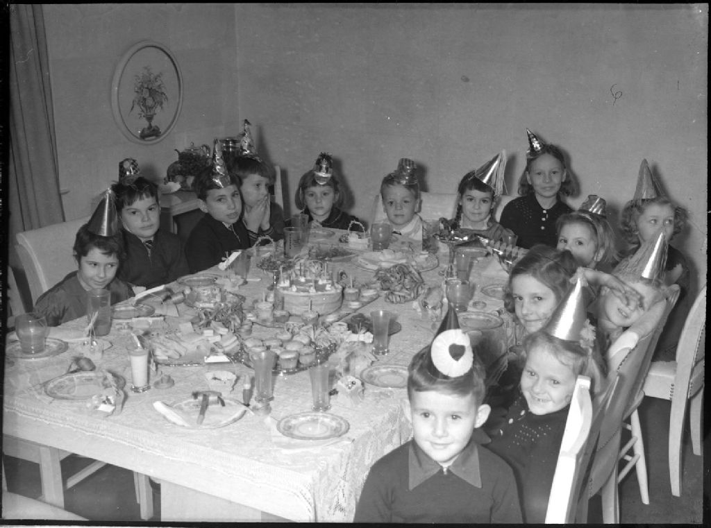 Nous voyons un groupe d'enfants rassemblés autour d'une table à l'occasion d'une fête d'enfants au domicile de monsieur Hector Fontaine, 4979, avenue Dornal à Montréal. Nous remarquons qu'ils sont coiffés de chapeaux de carton et que la table est garnie de sandwichs, petits fours et gâteau avec bougies