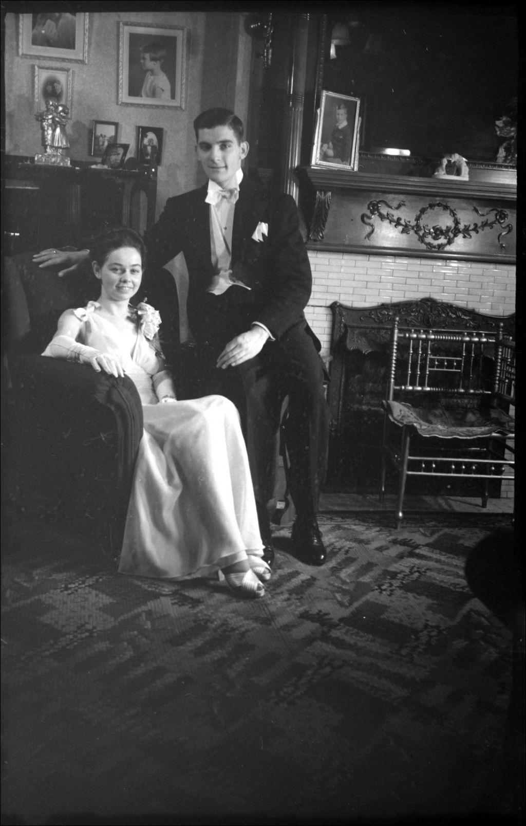 Nous voyons un jeune homme du nom de Nelson Baldock domiciliée au 3561, avenue du Parc à Montréal, posant en toxedo en compagnie d'une jeune fille du nom de Betty Crossan assise dans un fauteuil et vêtue d'une robe de soirée, avec bouquet de corsage. Il se trouvent dans un salon au décor cossu. Nous apercevons derrière eux un foyer, un vaisselier et des bibelots