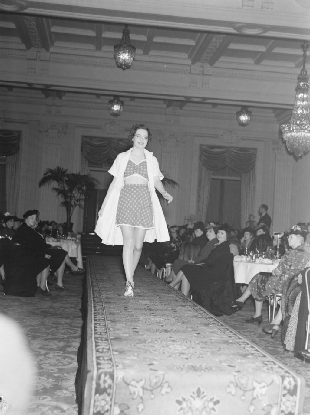 Nous voyons un mannequin défilant vêtu d'un ensemble de plage sur une estrade disposée en longueur, devant les membres de l'«American Women's Club» à l'Hôtel Windsor, 1160, rue Peel à Montréal. Nous apercevons des lustres, des tentures aux fenêtres et des plantes d'intérieur
