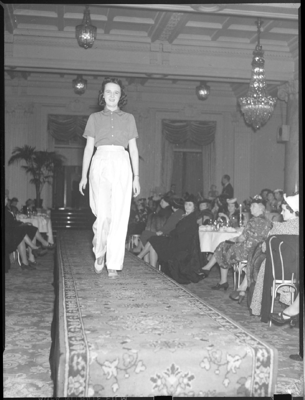 Nous voyons un mannequin défilant vêtu d'un chemisier et d'un pantalon sur une estrade disposée en longueur devant les membres de l' «American Women's Club» à l'Hôtel Windsor, 1160, rue Peel à Montréal. Nous apercevons des lustres, des tentures aux fenêtres et des plantes d'intérieur