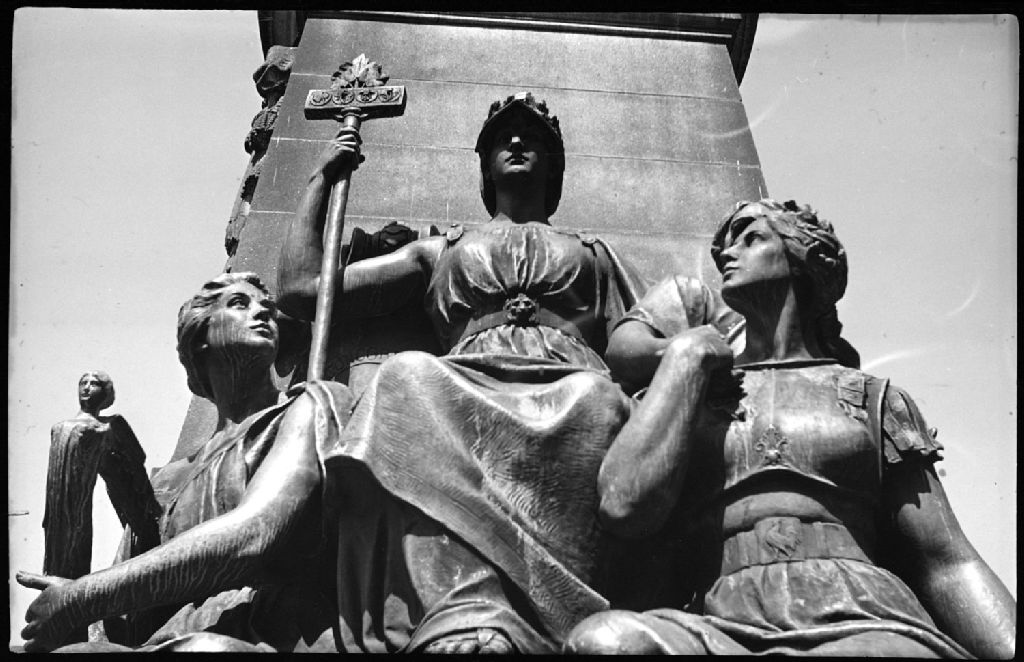 Nous voyons en contre-plongée la partie inférieure du monument au Roi Édouard V11, situé au Square Phillips, rue Sainte-Catherine Ouest, à l'angle de l'avenue Union à Montréal. Nous apercevons un groupe de figures féminines dont une couronnée et portant un sceptre