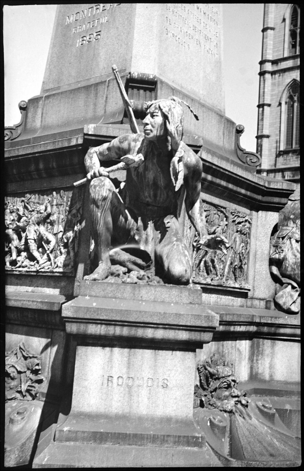 Nous apercevons au pied du Monument à Paul Chomedey de Maisonneuve érigé Places d'Armes dans le Vieux Montréal la statue d'un Iroquois un genou au sol et tenant un tomahawk en main