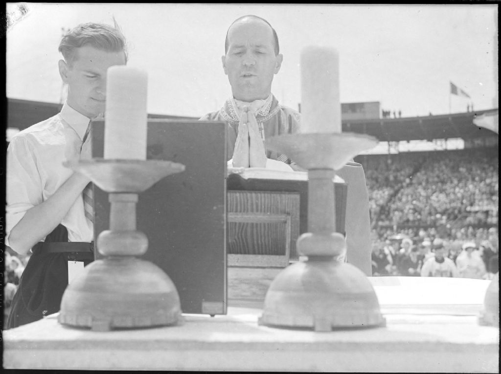 Lors de noces collectives organisées par le Mouvement des Jeunesses ouvrières catholiques ou J.O.C., nous voyons le Père Roy célébrant à ciel ouvert une messe dans le stade Delorimier à Montréal devant un auditoire imposant