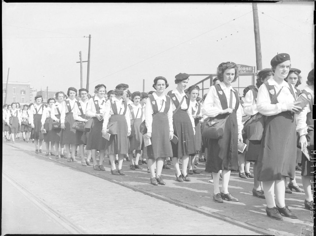 Lors de noces collectives organisées par le Mouvement des Jeunesses ouvrières catholiques ou J.O.C., nous voyons défilant dans les rues de Montréal une troupe de jeunes femmes d'allégeance jociste