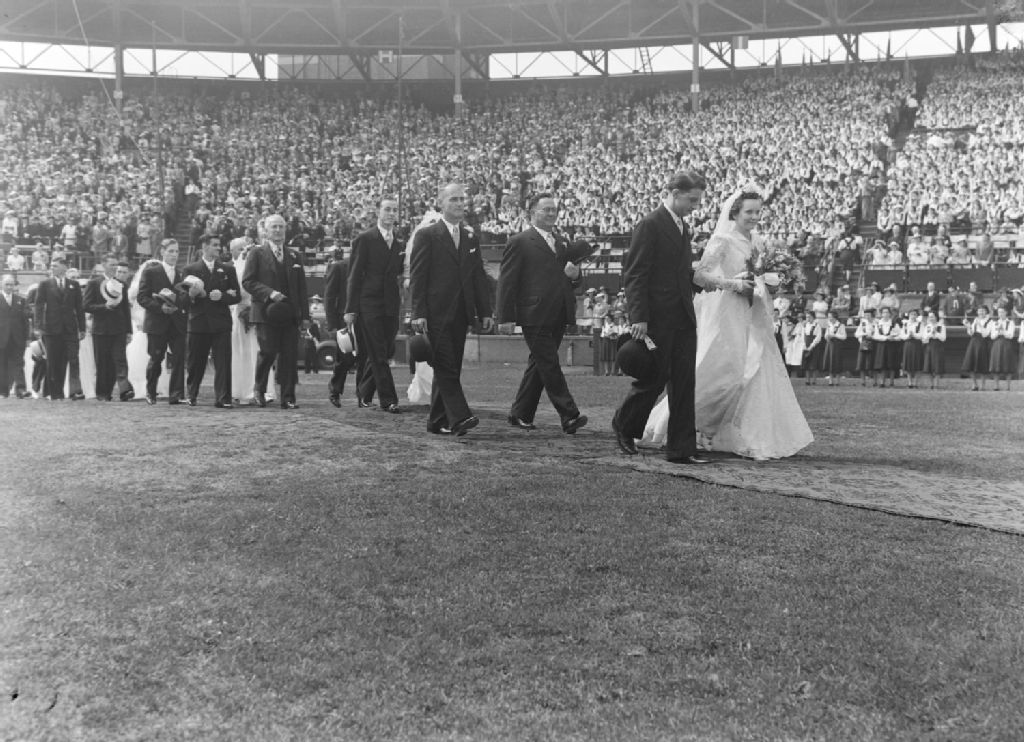 Lors de noces collectives organisées par le Mouvement des Jeunesses ouvrières catholiques ou J.O.C., nous voyons un défilé de couples de jeunes mariés sous les yeux de la foule assemblée dans le stade Delorimier à Montréal