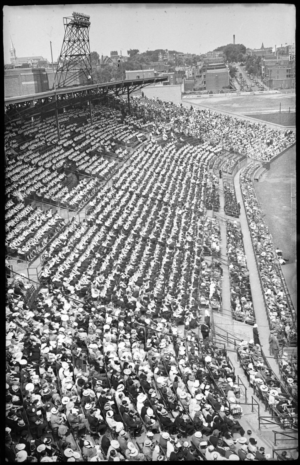 Lors de noces collectives organisées par le Mouvement des Jeunesses ouvrières catholiques ou J.O.C., nous voyons en plongée les gradins du Stade Delorimier à Montréal remplis de spectateurs assistant à l'événement