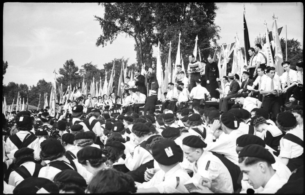 Lors de noces collectives organisées par le Mouvement des Jeunesses ouvrières catholiques ou J.O.C., nous voyons une foule rassemblée à l'Île Sainte-Hélène parmi laquelle nous distinguons des jocistes arborant des étendards