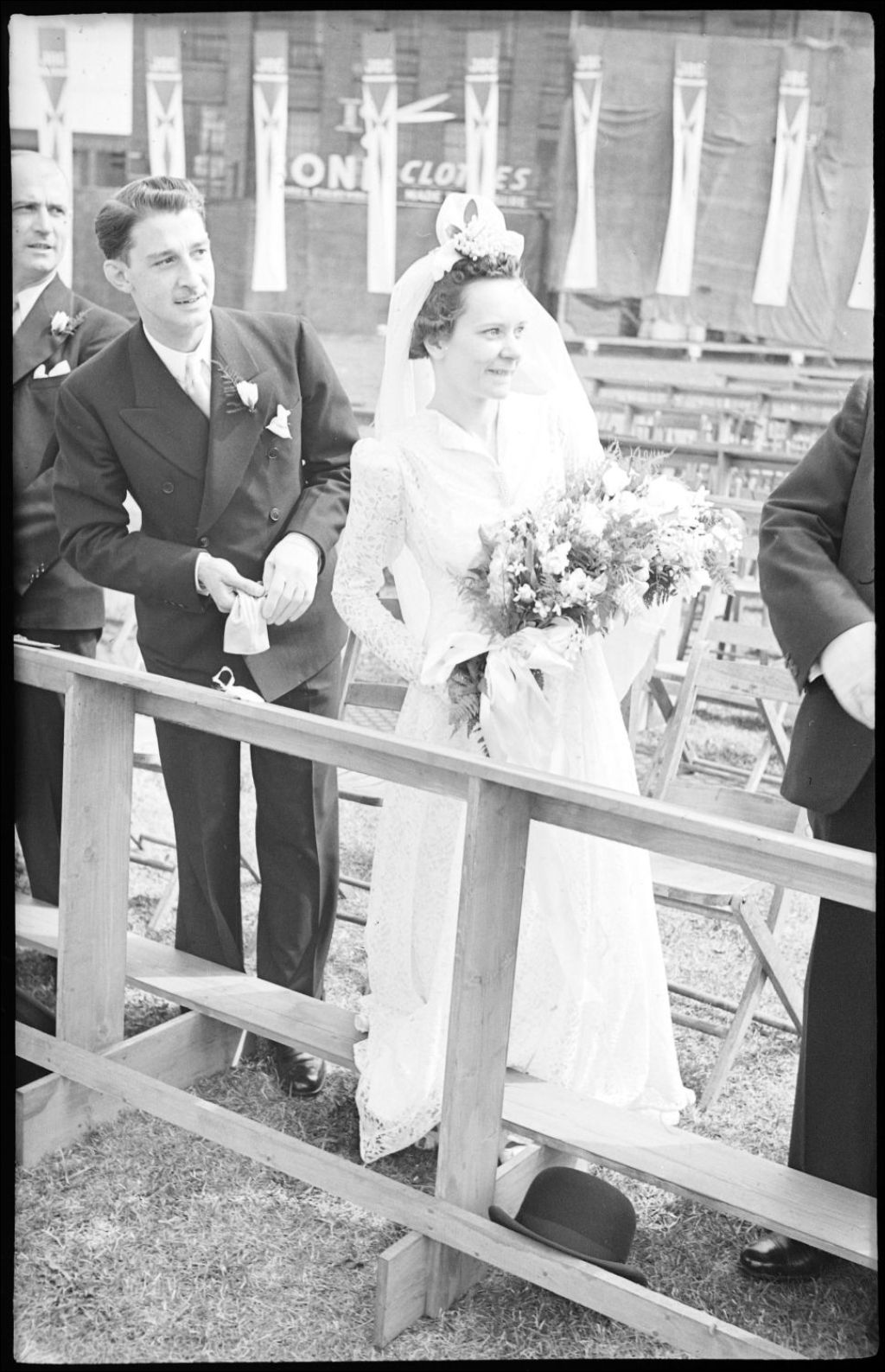Lors de noces collectives organisées par le Mouvement des Jeunesses ouvrières catholiques ou J.O.C., nous voyons un couple de jeunes mariés au Stade Delorimier à Montréal debout sur une passerelle