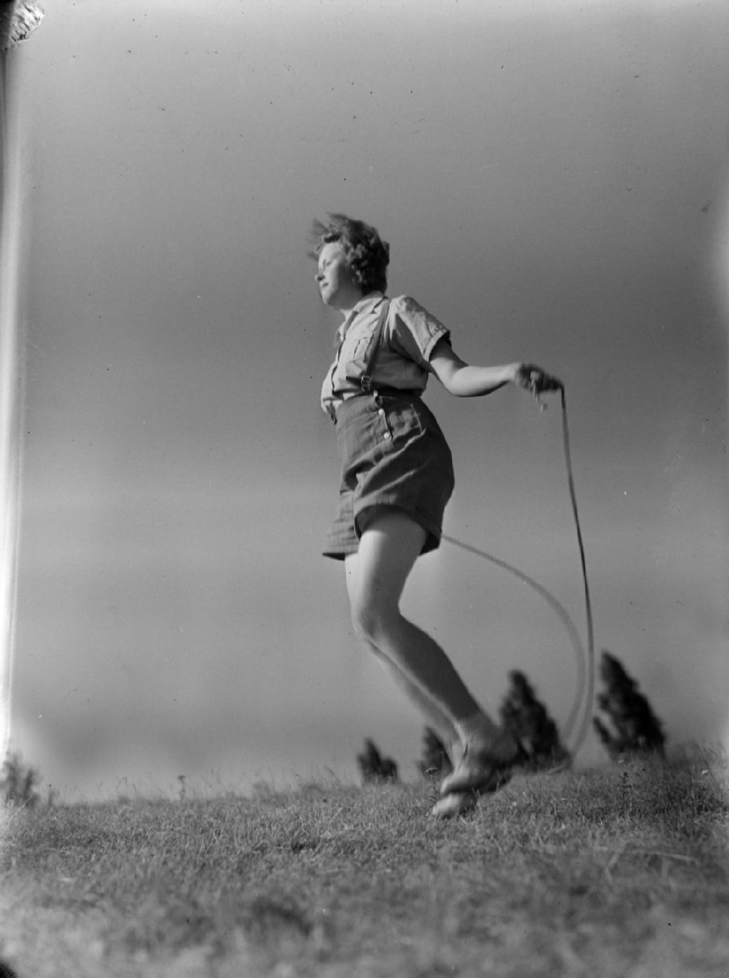 Nous voyons une jeune fille du nom de Ruth Smith en tenue estivale sautant à la corde dans un champ