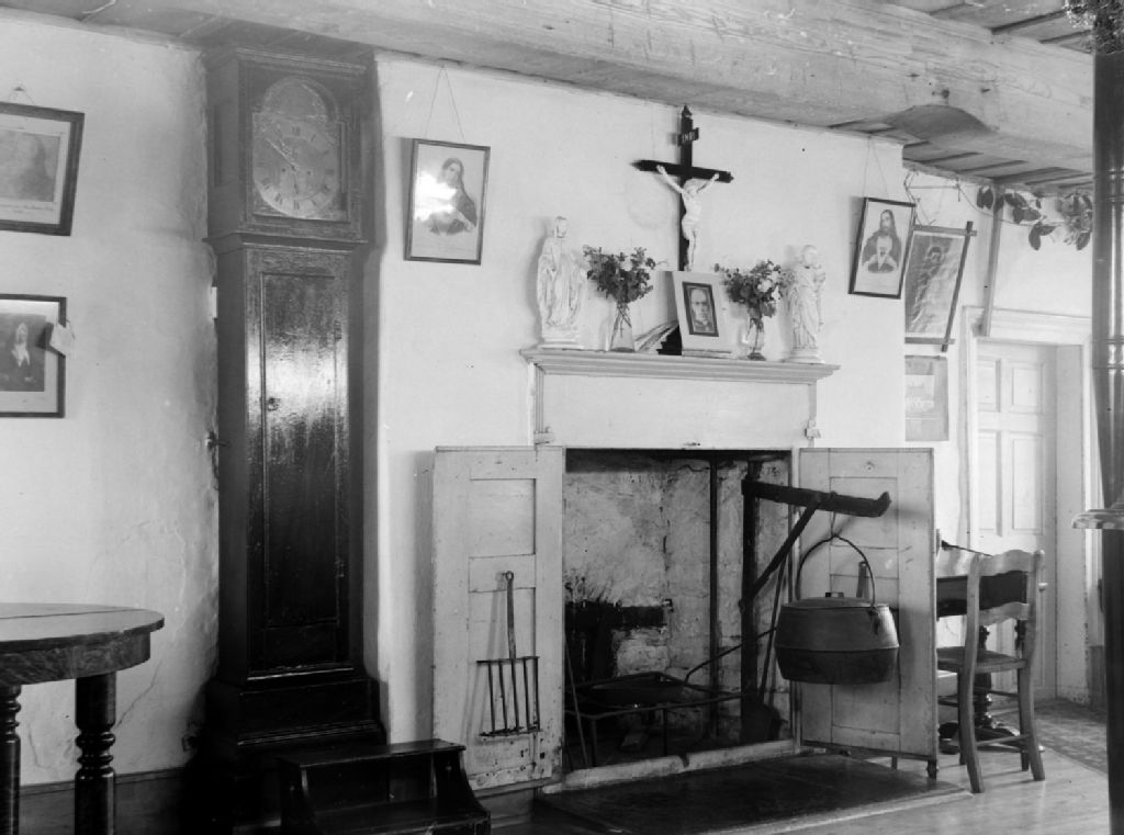 Nous voyons l'intérieur de la salle à manger du couvent des Soeurs de la Congrégation à Pointe-Saint-Charles dans le sud-ouest de Montréal. Nous apercevons divers élements de mobilier : une horloge grand-père, un guéridon, une chaise tressée en paille de même qu'un âtre avec une marmite suspendue à un crochet. Nous remarquons sur le manteau de la cheminée et au mur des articles de culte