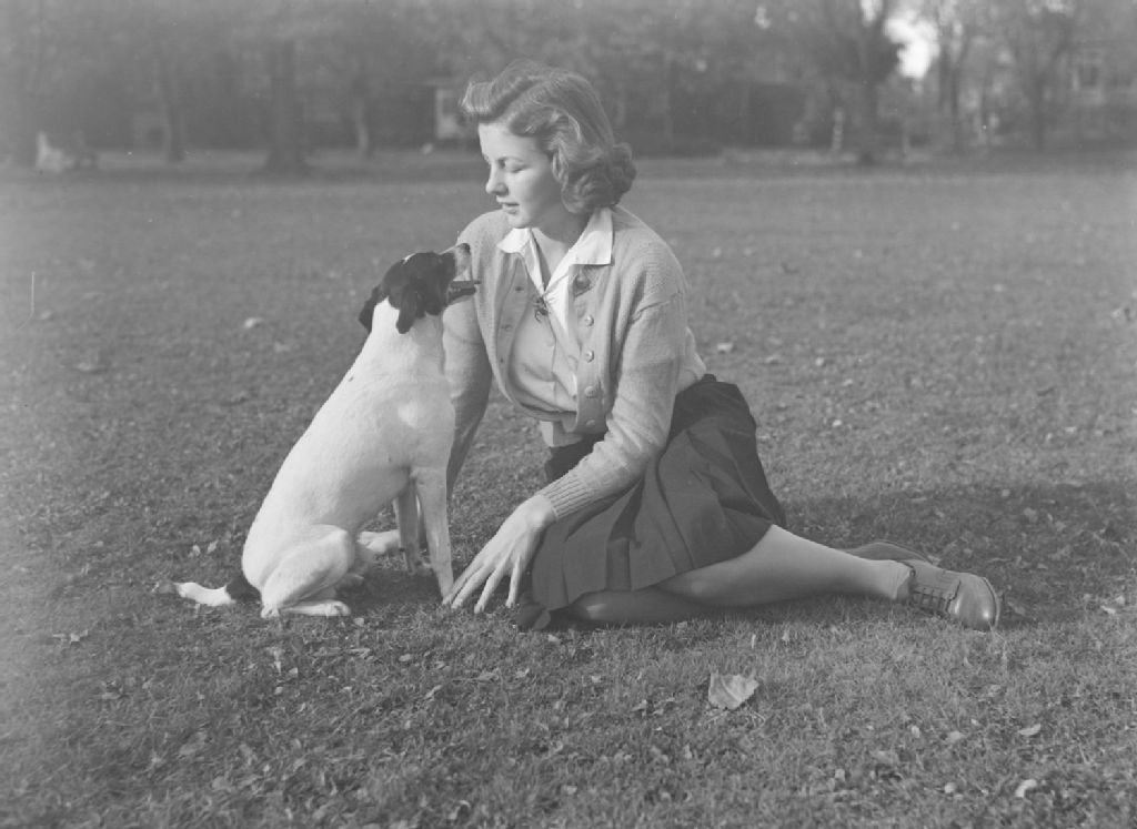 Nous voyons assise sur un parterre une jeune fille du nom de Joyce Skene avec son chien surnommé Peter tenant un bâton dans sa gueule