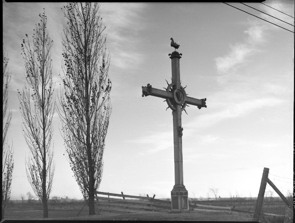 Nous voyons une croix de chemin située sur la ferme des Lemieux, surmontée d'une girouette en forme de coq et avec, en son centre, un Sacré-Coeur sculpté