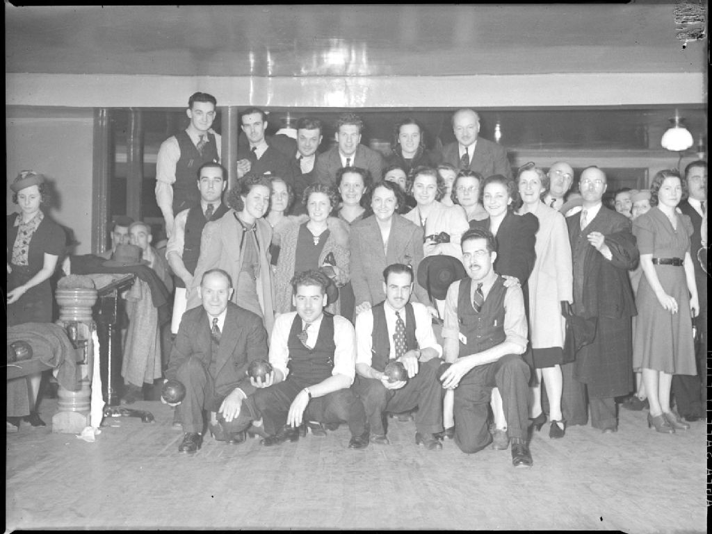 Nous voyons l'équipe de bowling de chez L. N. Messier Nouveautés, 1551-1565 de l'avenue Mont-Royal Est à Montréal», posant en groupe dans une salle de jeu de quilles